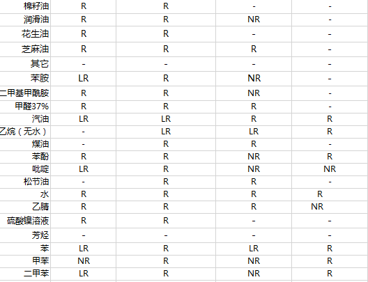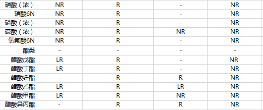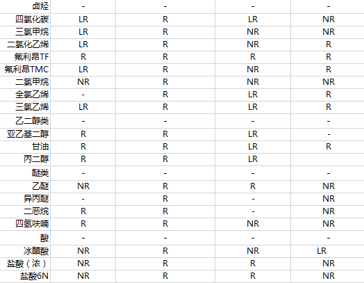 此表仅供参考:R: 表示能耐受此化学试剂,“-”:表示目前没有数据,LR: 表示能有限度的耐受此化学试剂,NR: 不能耐受此化学试剂